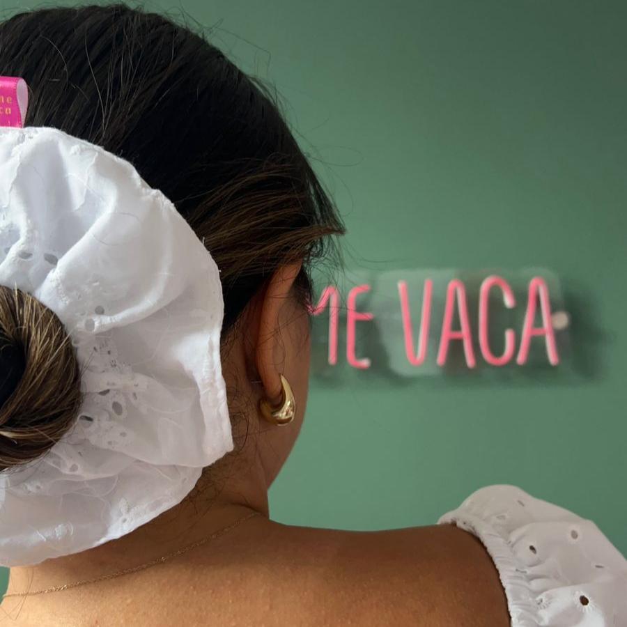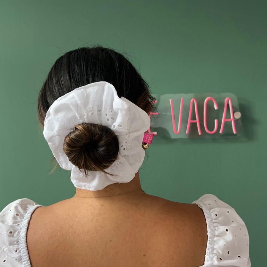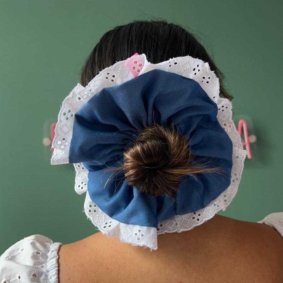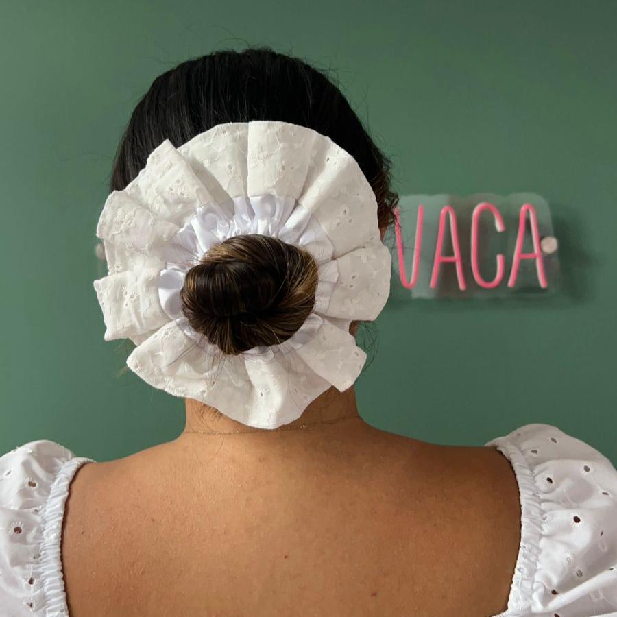 Scrunchie bordada, diseñada para añadir un toque de sofisticación y detalle a tus peinados. Perfecta para quienes buscan un estilo único y elegante.